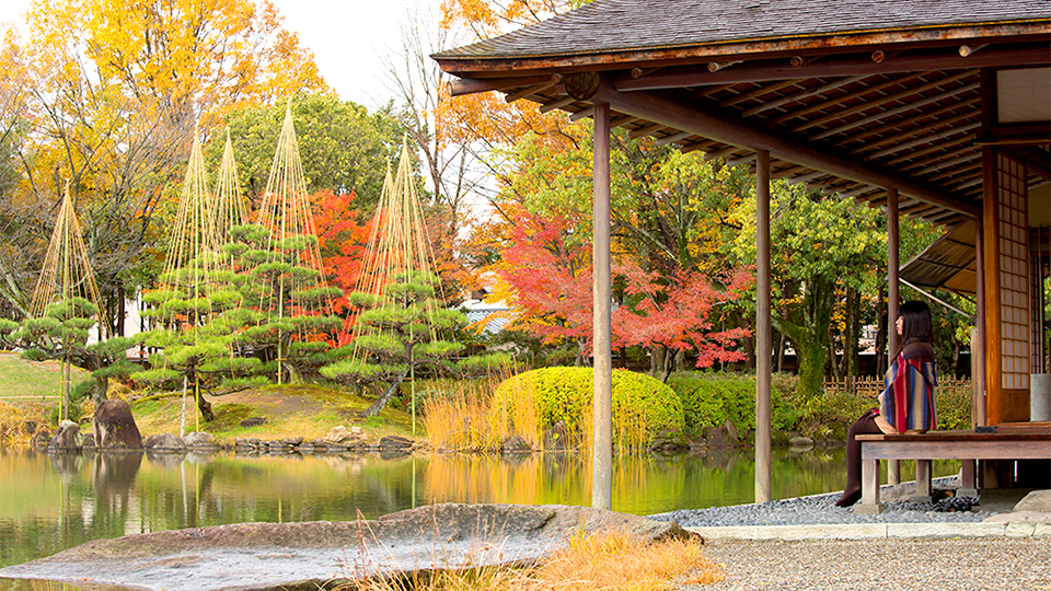かつての福井藩主松平家の別邸。回遊式林泉庭園内の池に映る紅葉の美しさは見事です。また、秋には開園時間を延長し期間限定のライトアップもお楽しみいただけます。