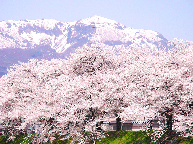 弁天桜は、福井県一の大河、九頭竜川に架かる勝山橋をはさんで伸びる堤防にある約450本の桜(ソメイヨシノ)で、一目千本とも言われています。約1.5キロメートルの桜並木が続き、桜の開花時期には、加越国境の山並みの残る残雪と、雪解けによる豊富な水が流れる九頭竜川をみることができ、勝山市らしい美しい風景を楽しむことができます。また、開花時期にあわせて開催される弁天桜まつり前後の一週間は、夜間にぼんぼりが点灯され、夜桜も楽しめます。